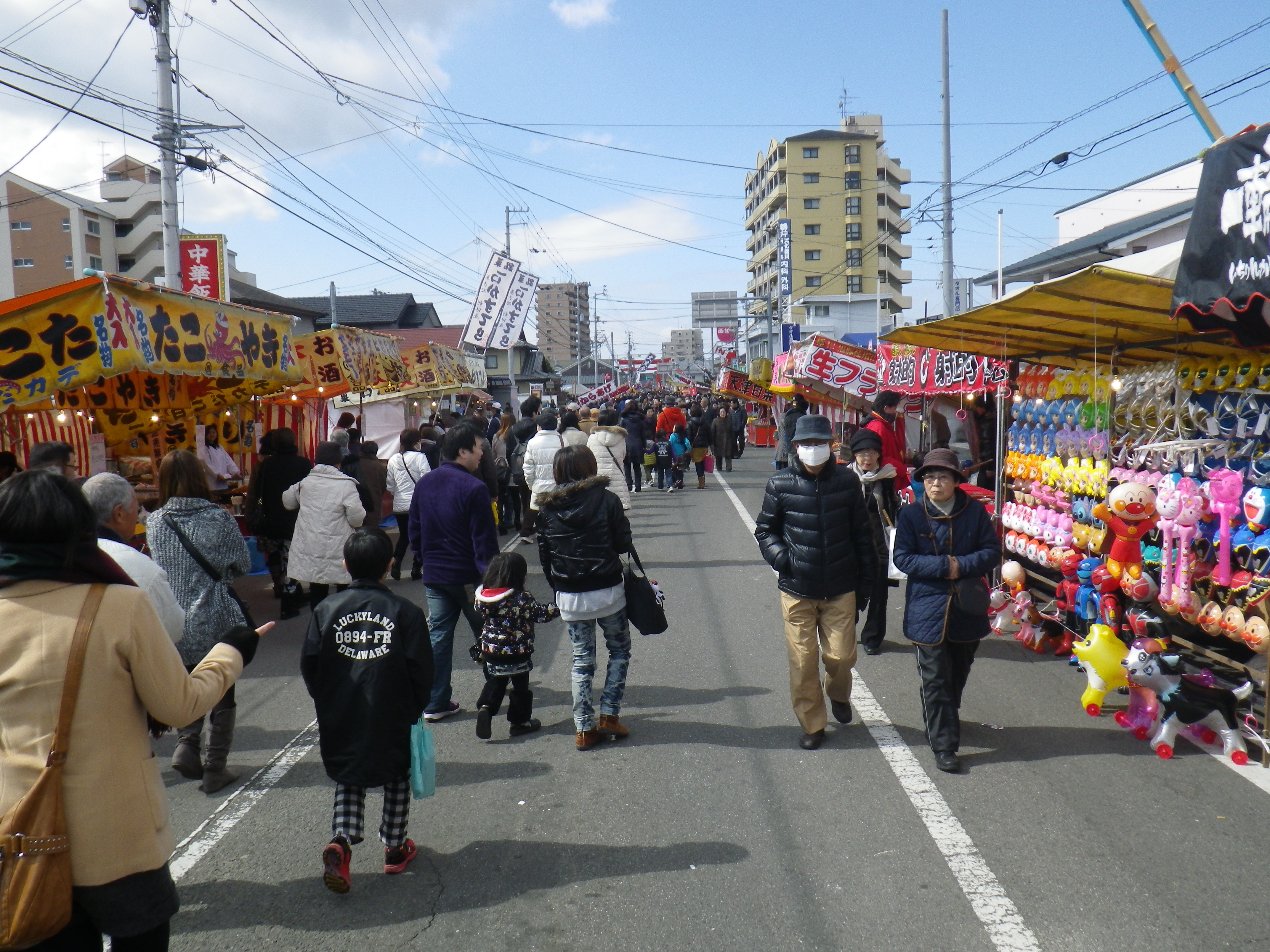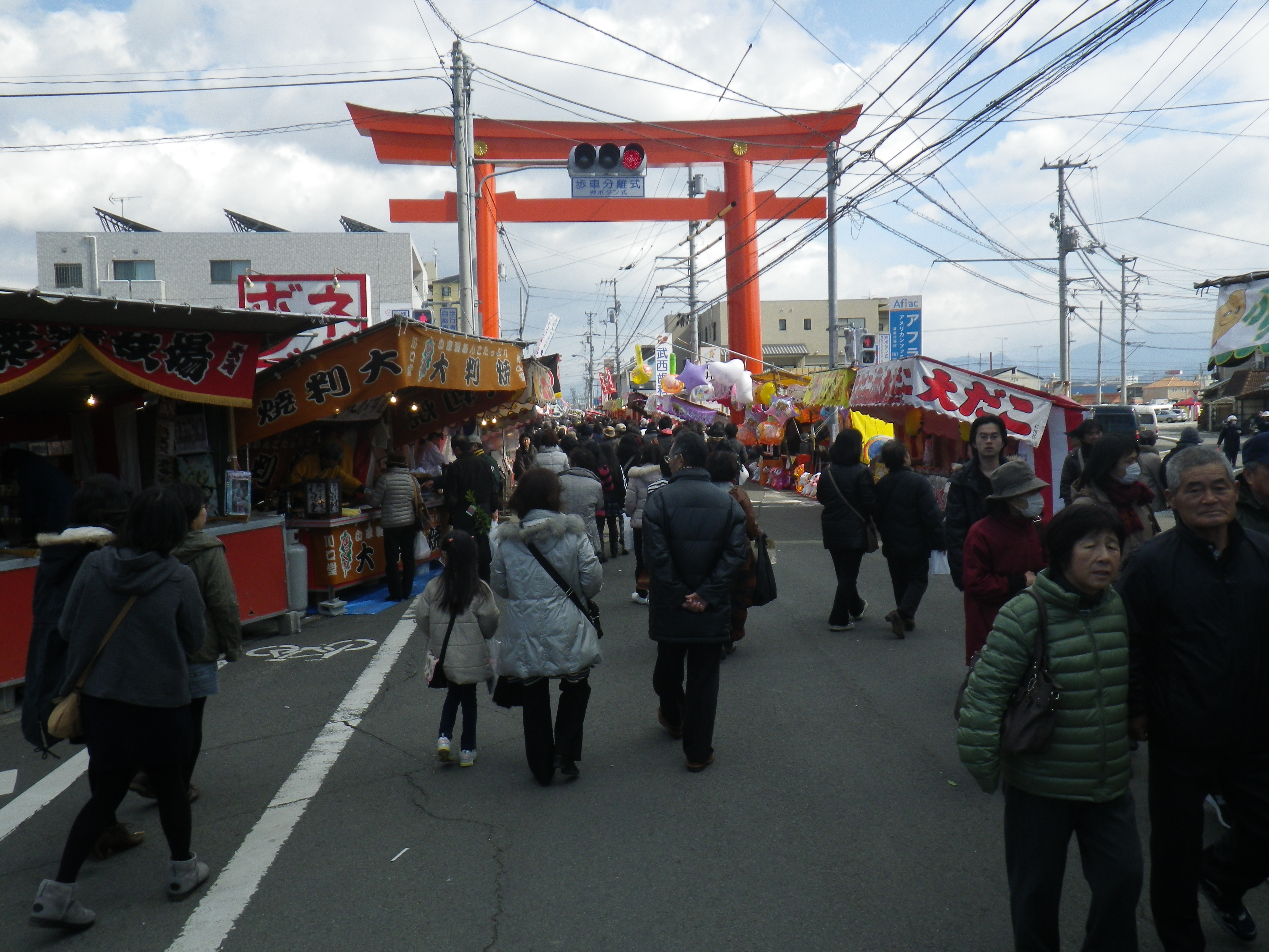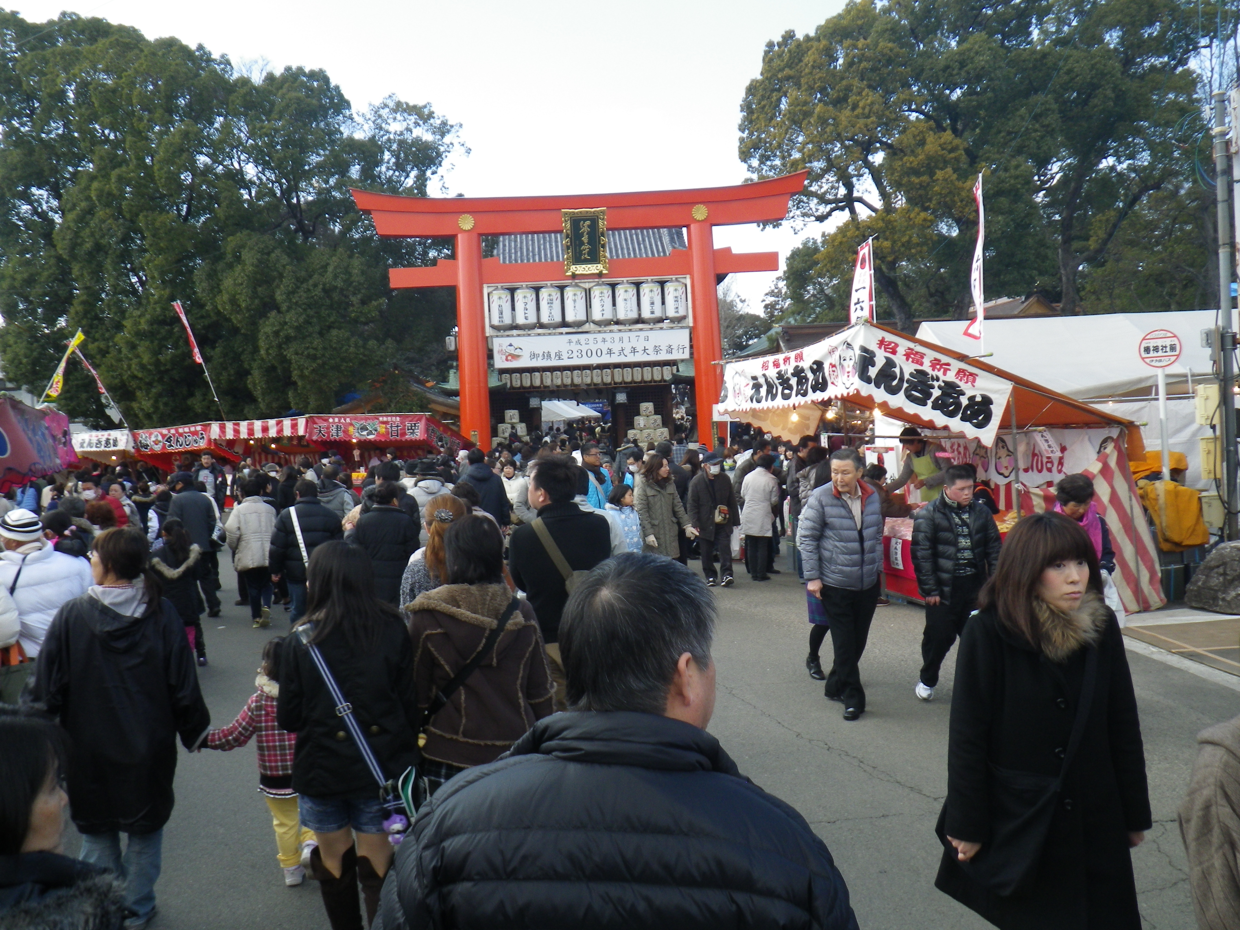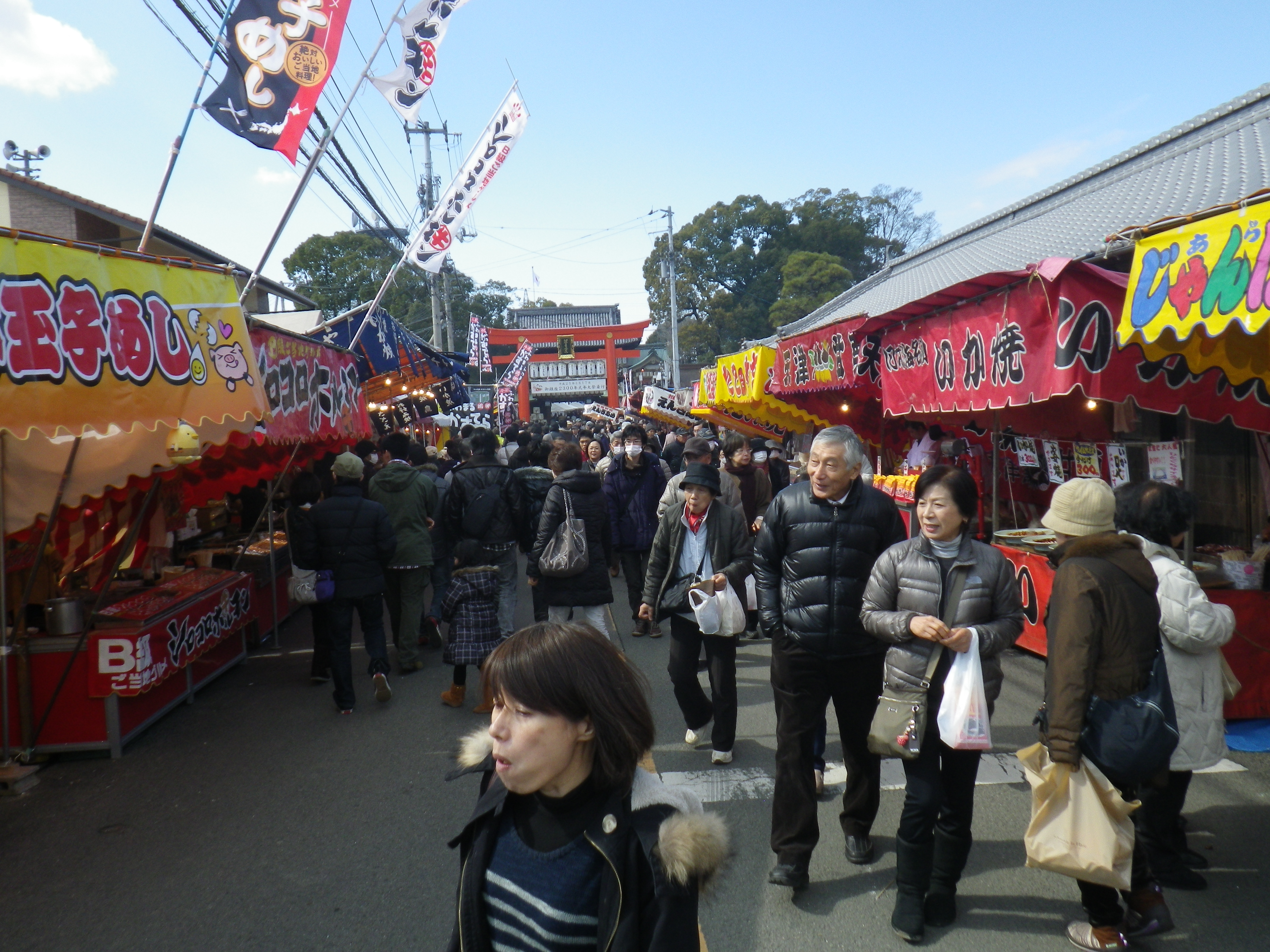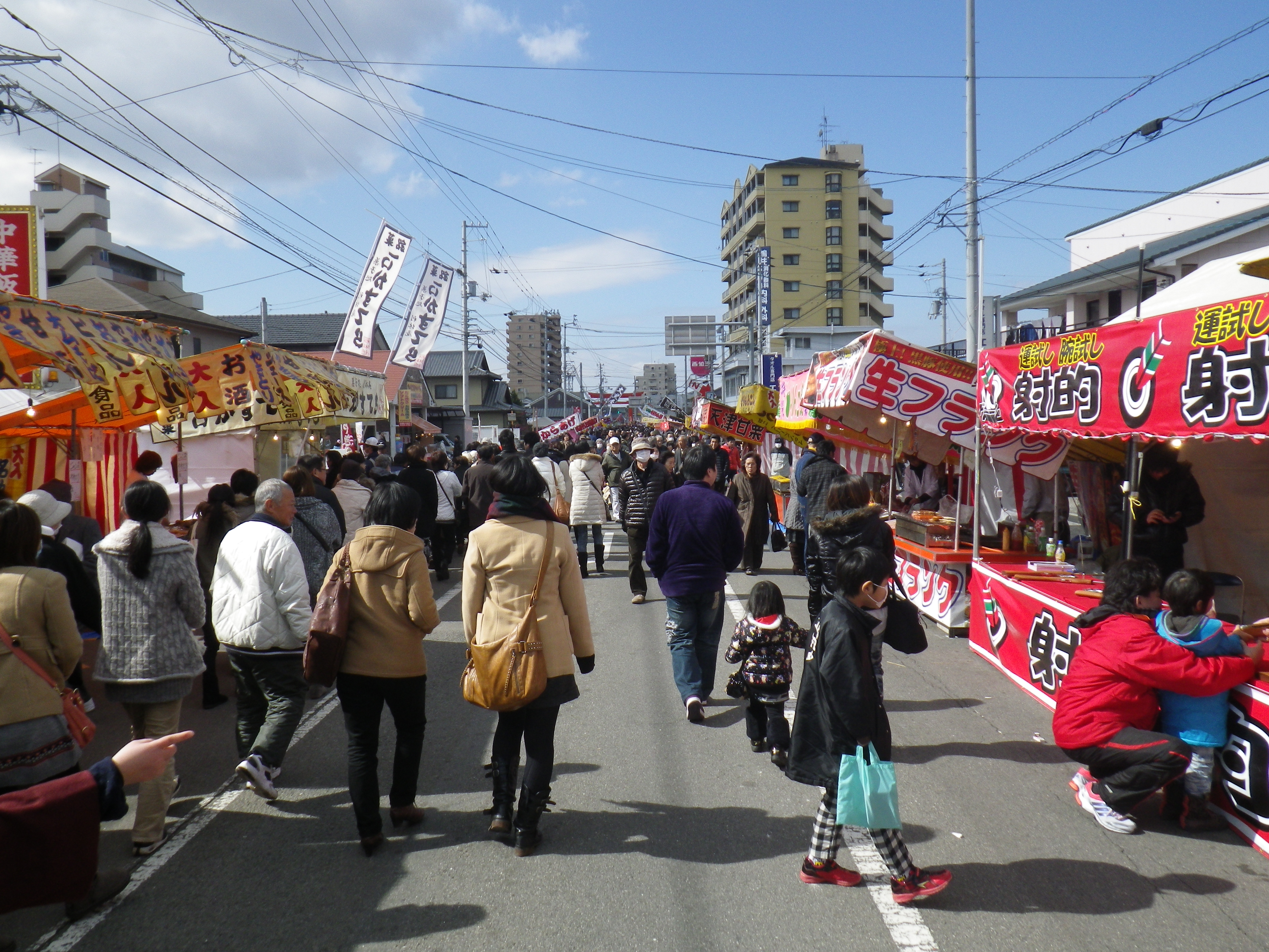 国道33号線交叉点から神社までの約1Kmの県道と平成15年に開通した「はなみづき通り」交叉点から神社まで約500mの県道は、全面交通遮断され、その県道両側に約800店の露店が立ち並ぶ状は圧巻です。