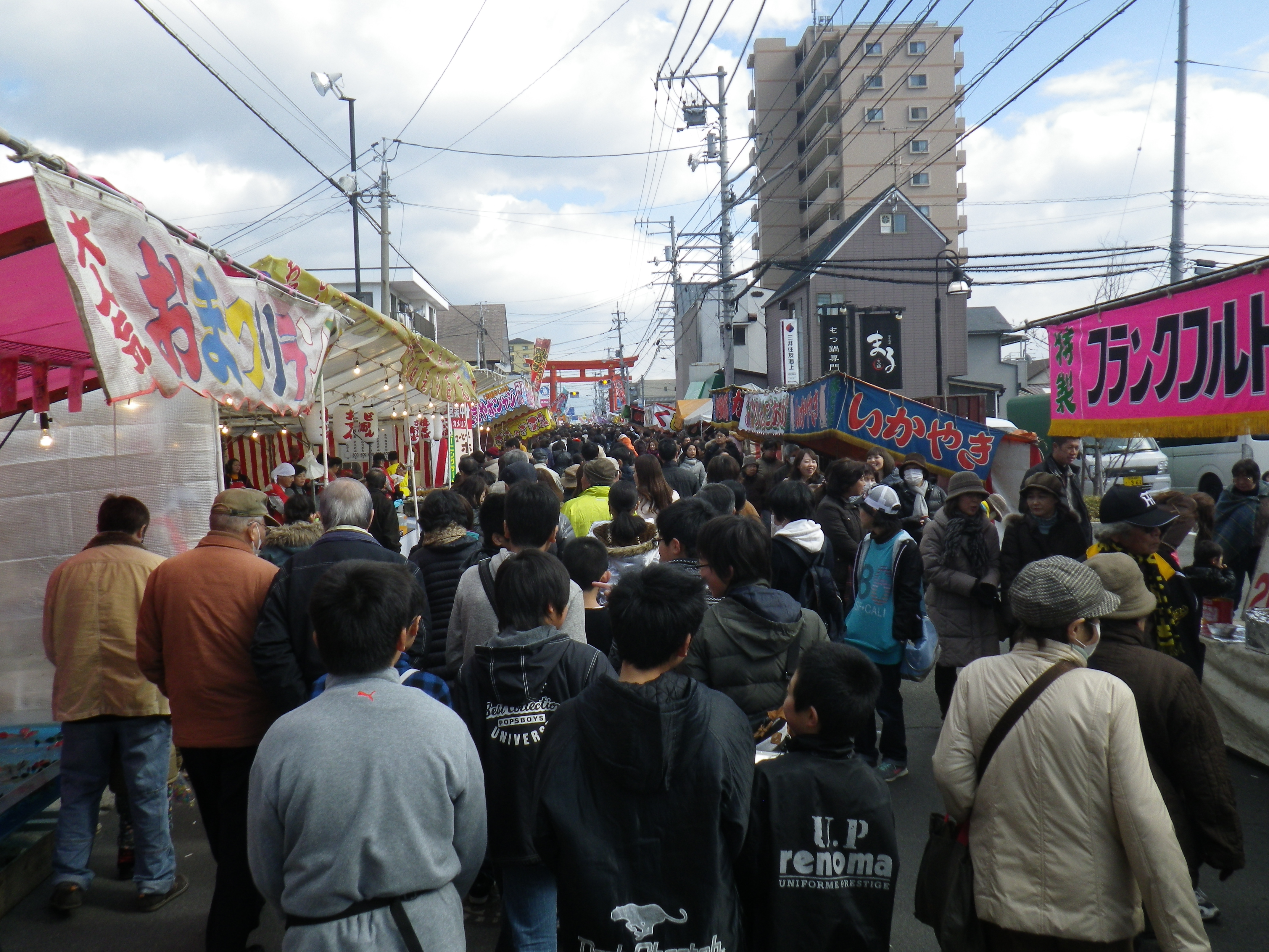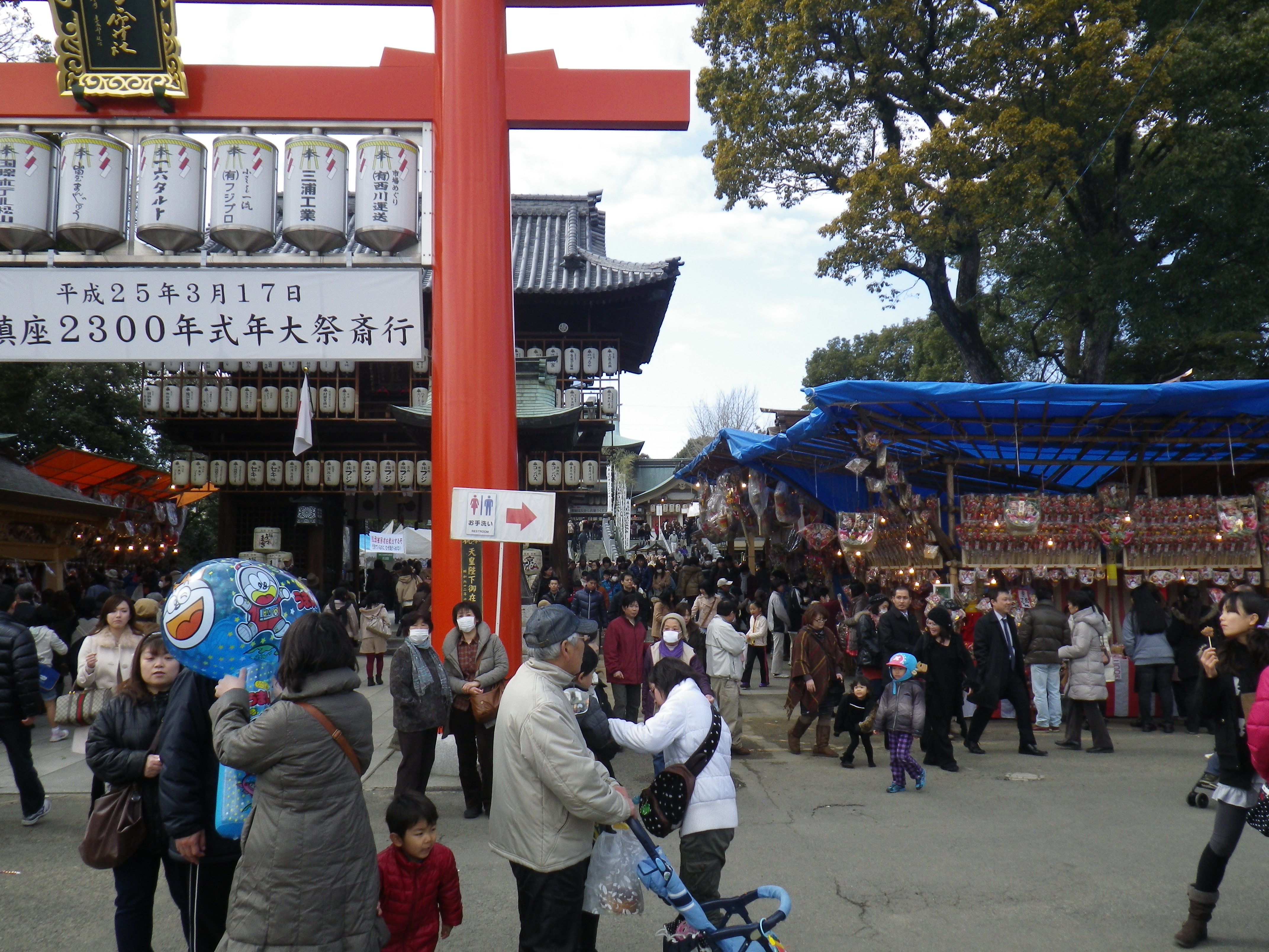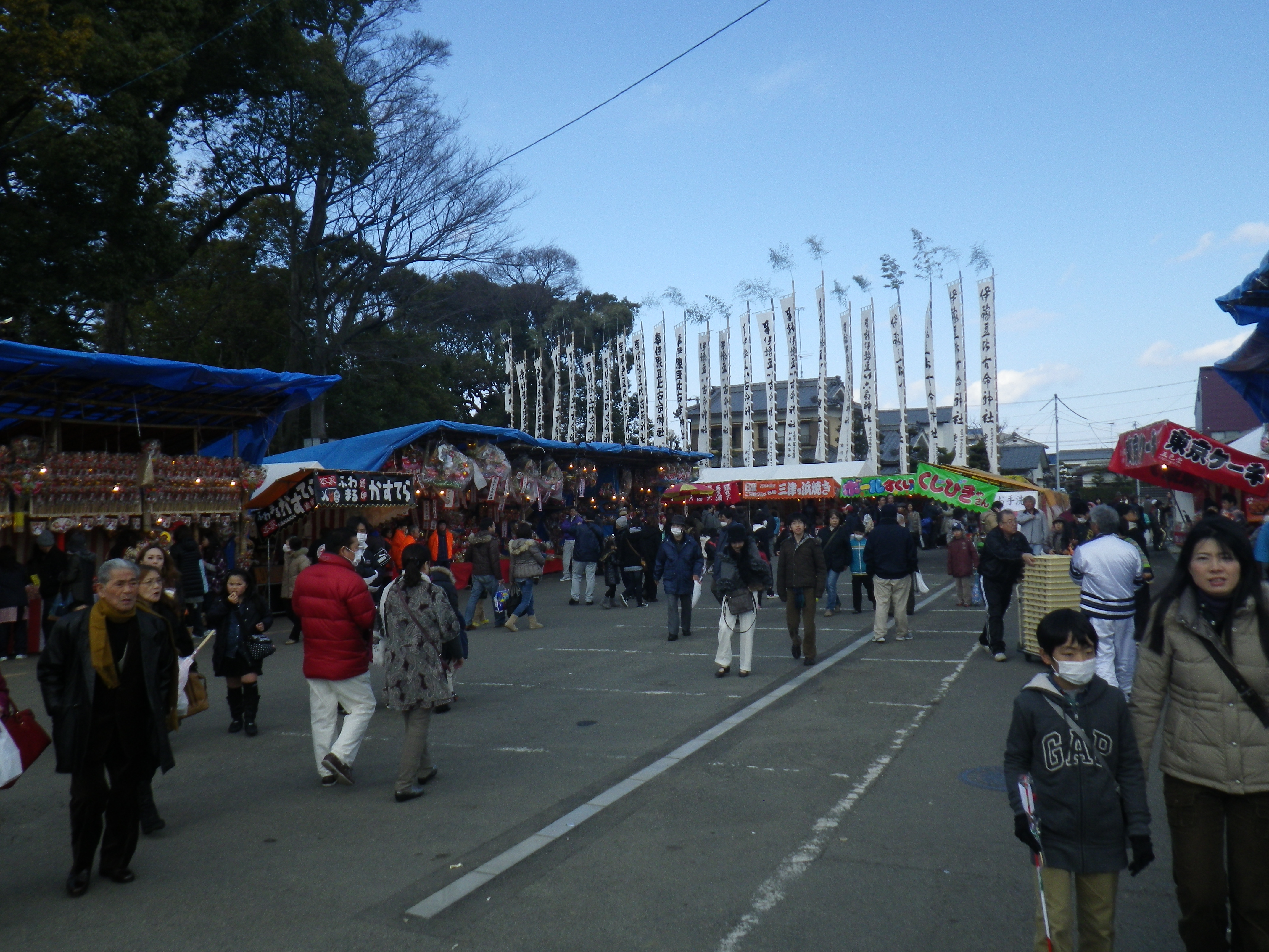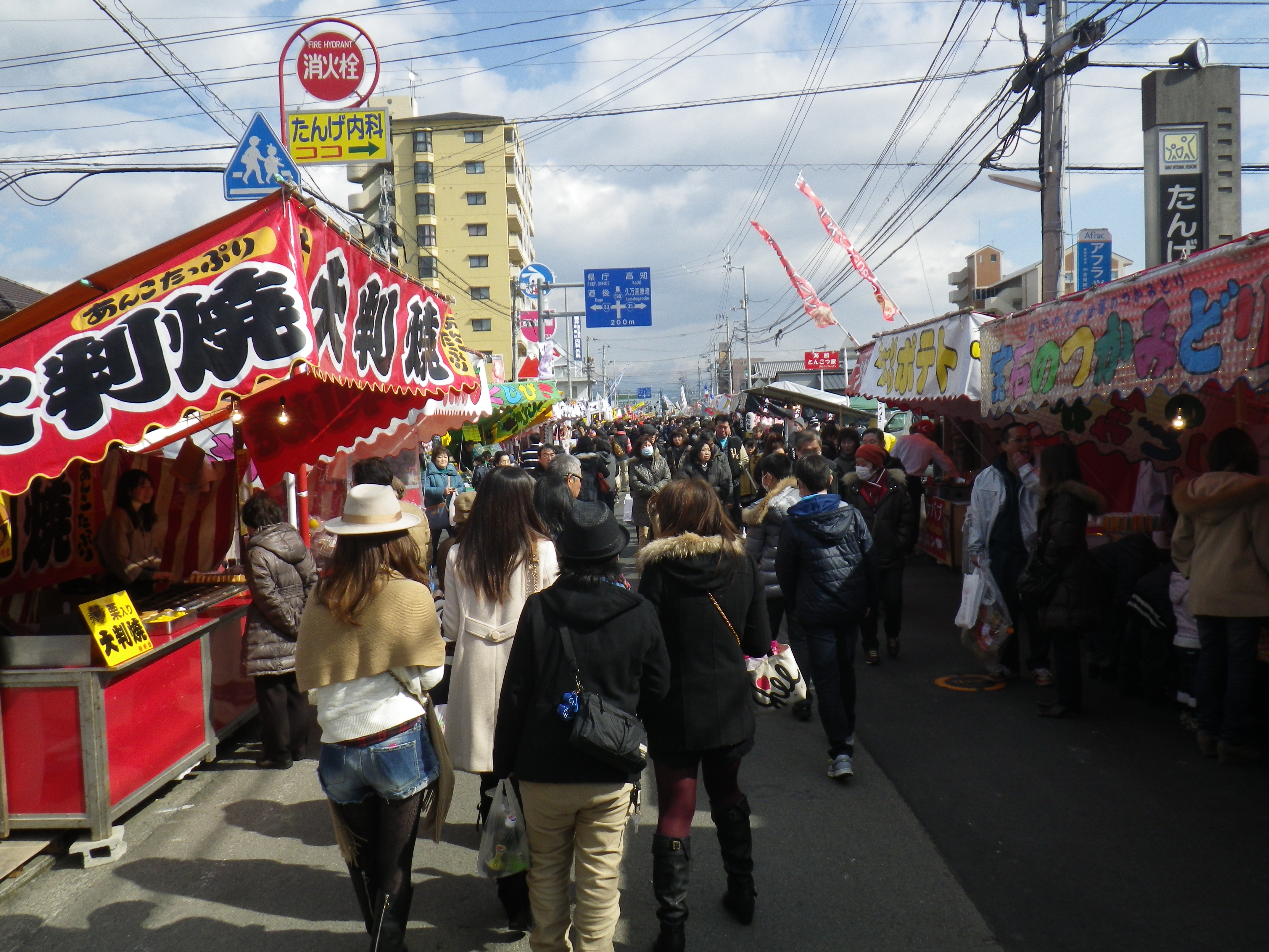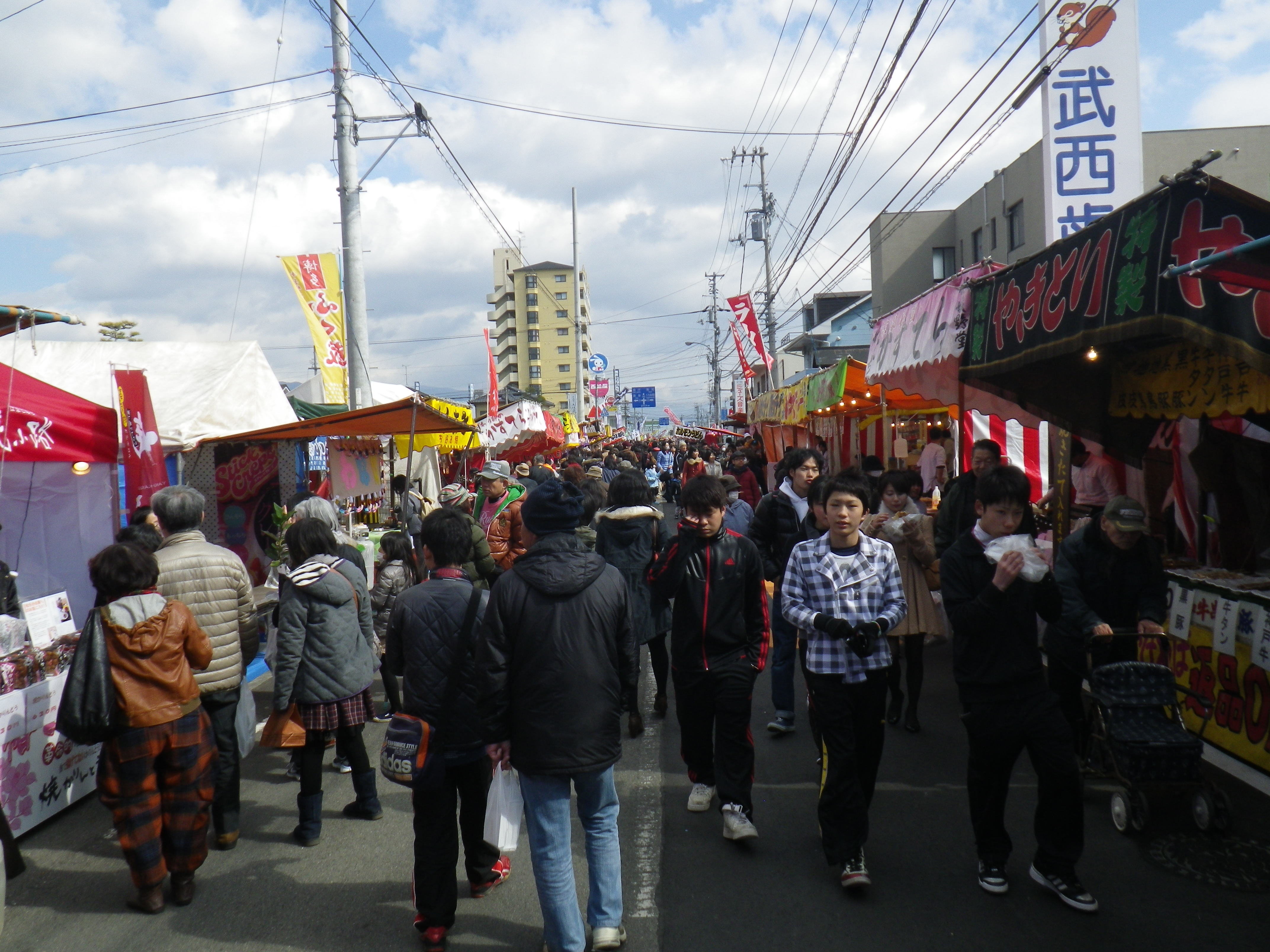 国道33号線交叉点から神社までの約1Kmの県道と平成15年に開通した「はなみづき通り」交叉点から神社まで約500mの県道は、全面交通遮断され、その県道両側に約800店の露店が立ち並ぶ状は圧巻です。