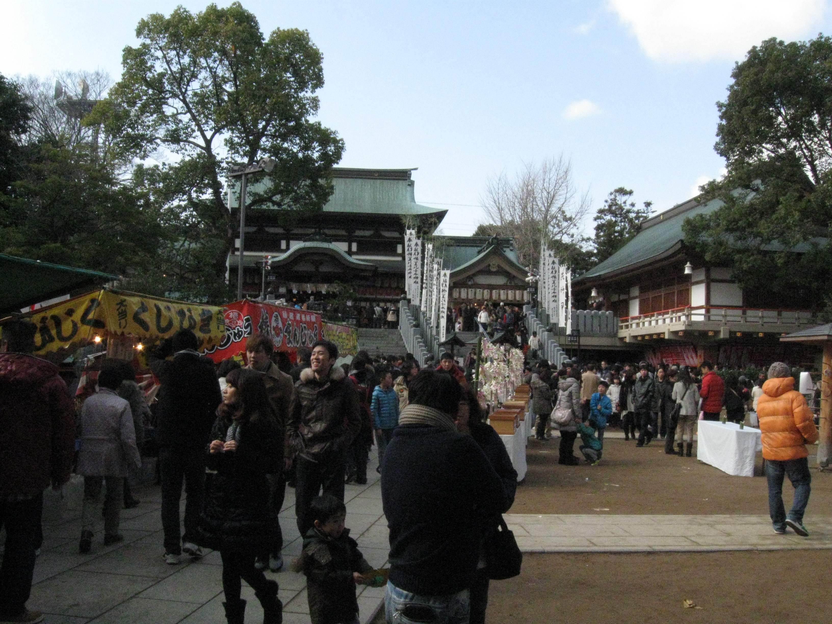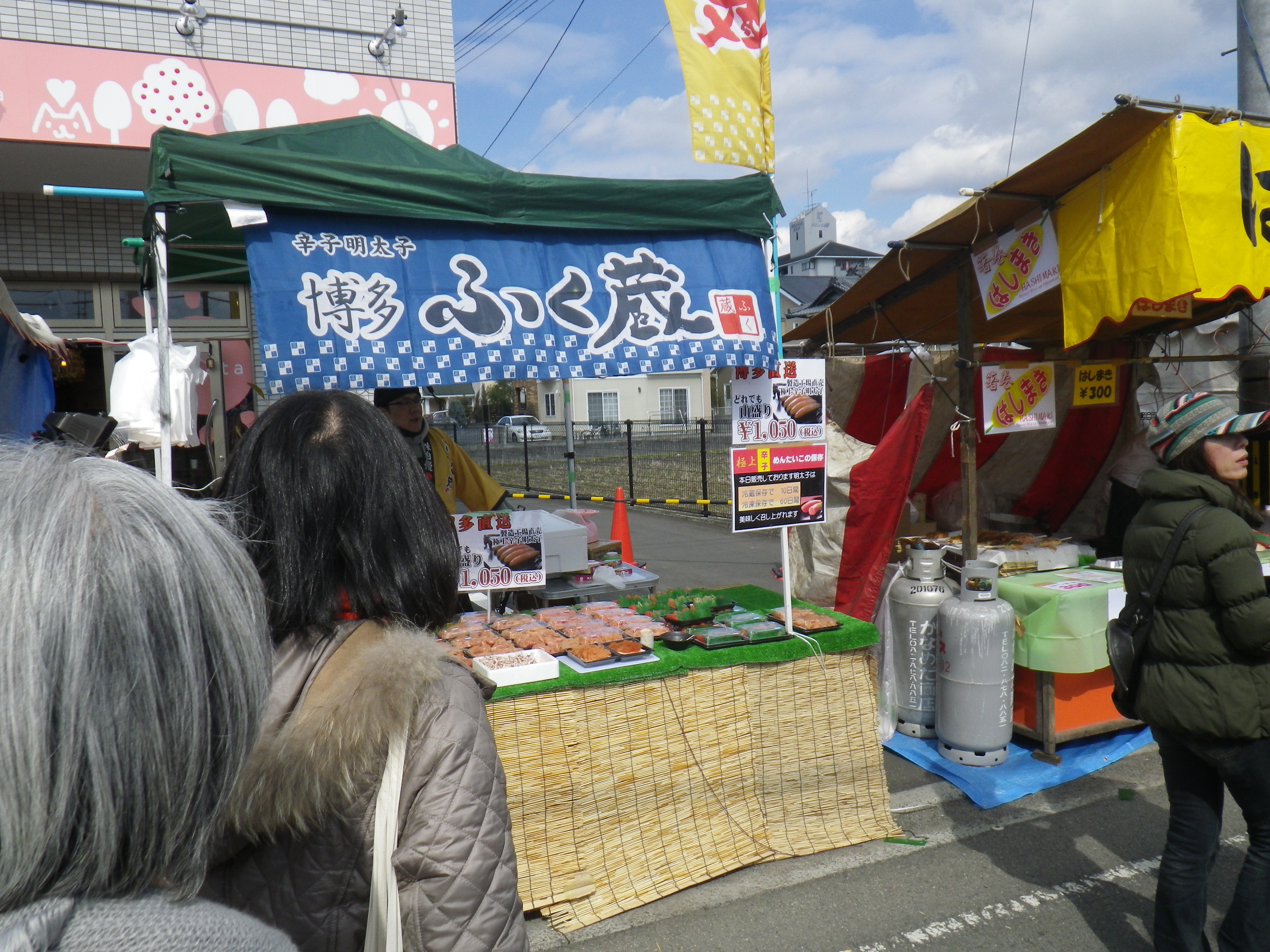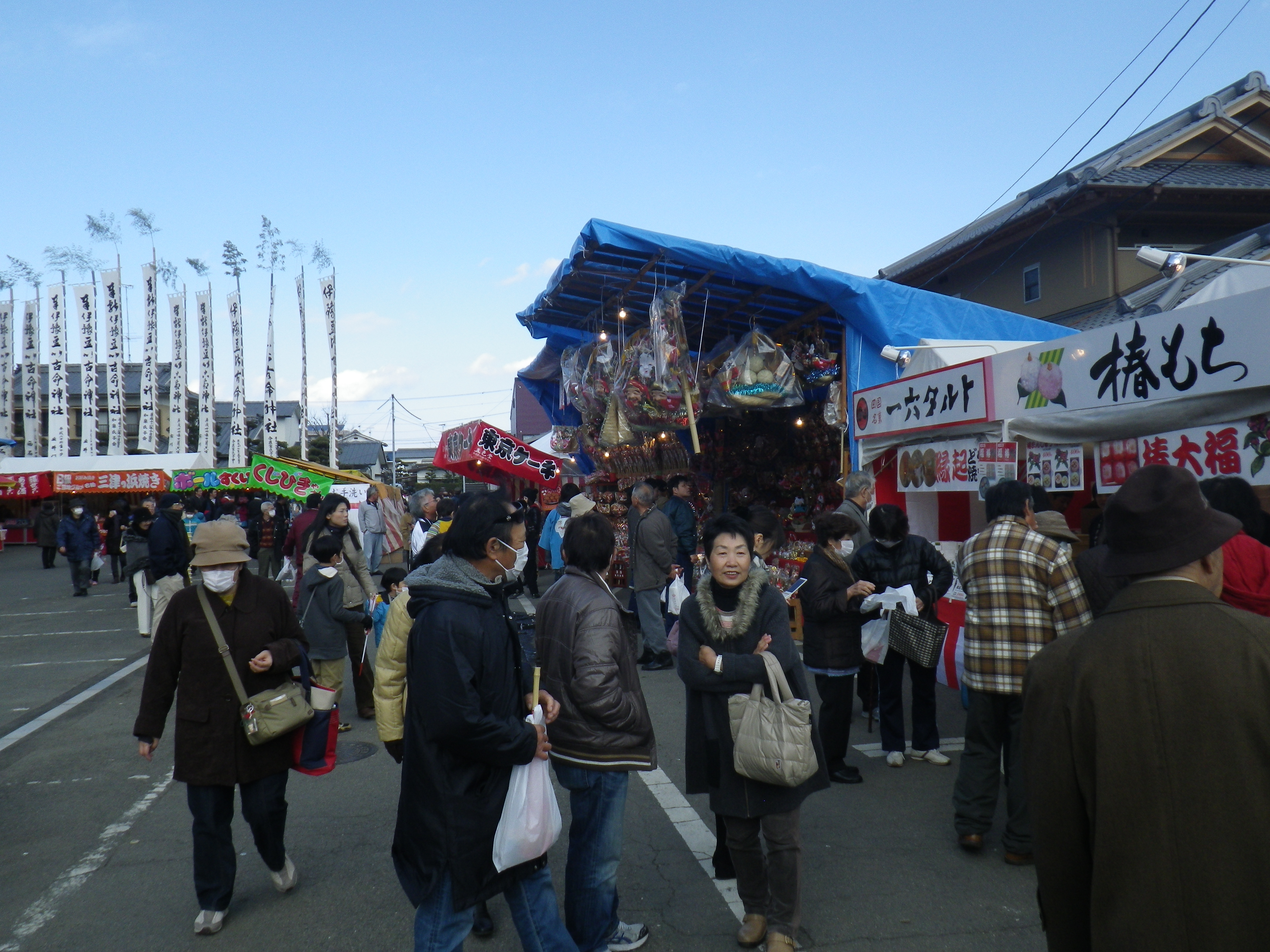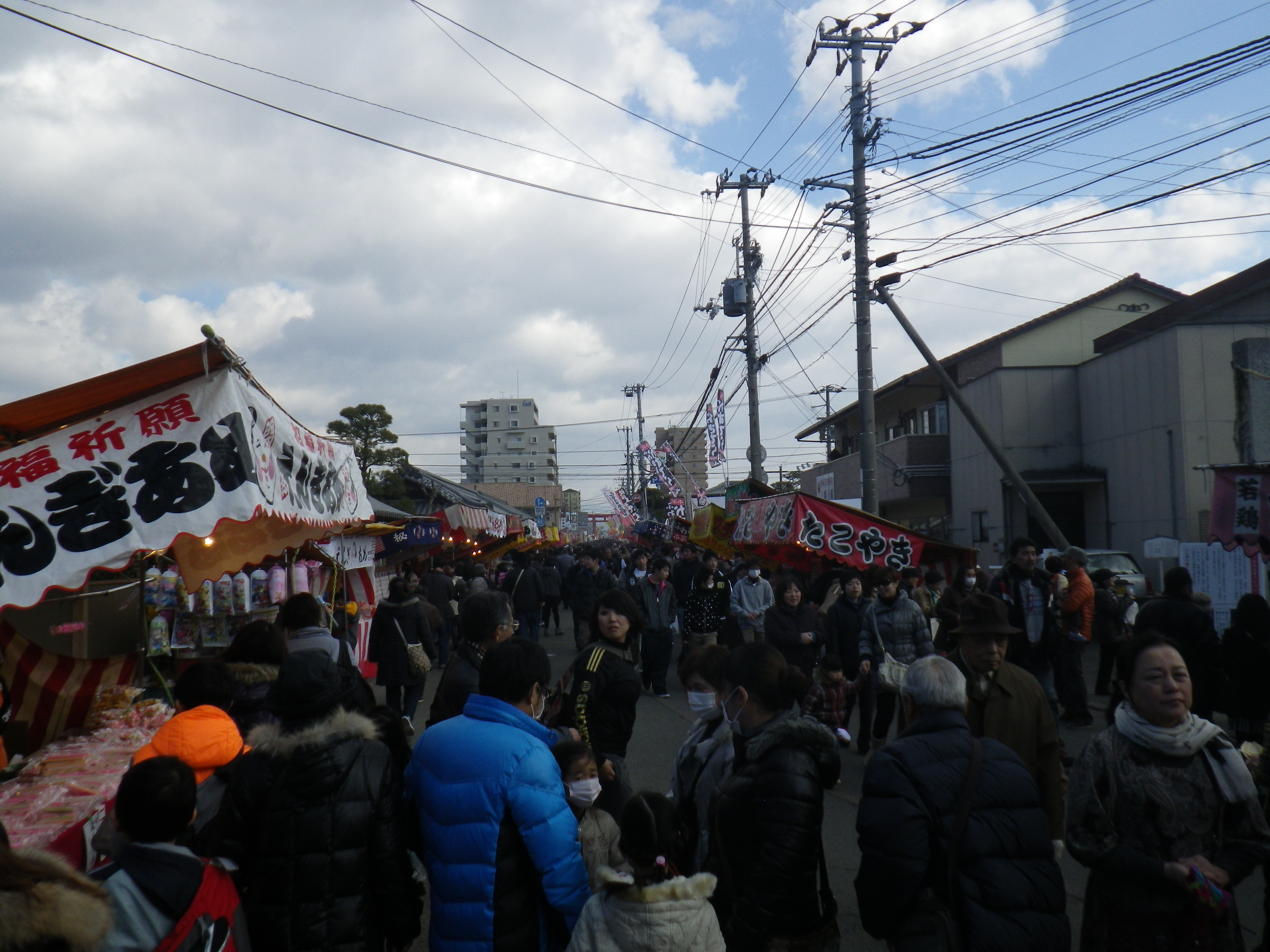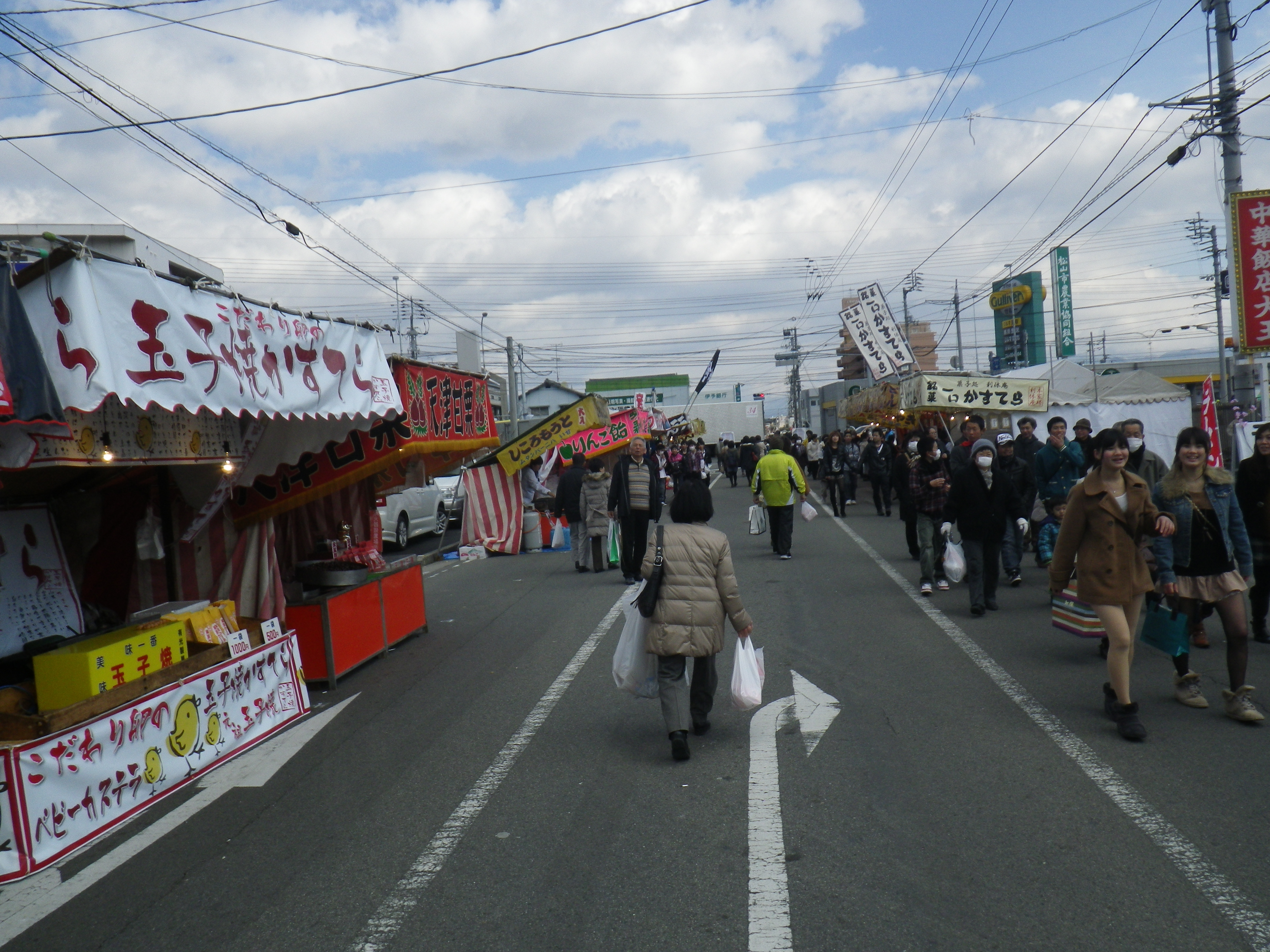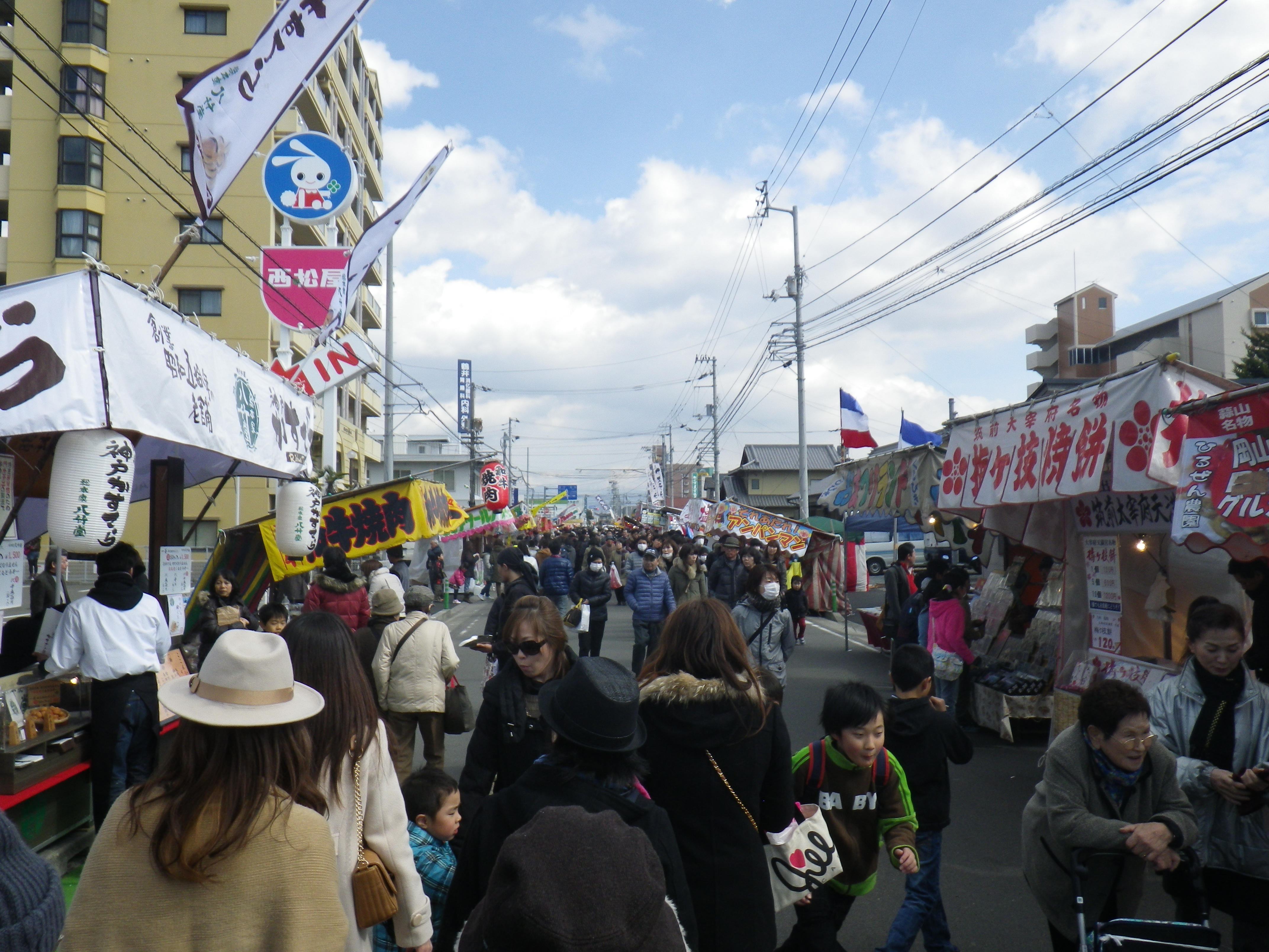 国道33号線交叉点から神社までの約1Kmの県道と平成15年に開通した「はなみづき通り」交叉点から神社まで約500mの県道は、全面交通遮断され、その県道両側に約800店の露店が立ち並ぶ状は圧巻です。